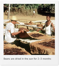 Equally important as proper growing of vanilla beans is how they are cured to bring out their full flavor. Curing is a manual process that began in the early 1900s. The mature green beans are picked and, within a short period of time, placed in boiling water for three minutes to arrest growth. Then, they are sweated in burlap-wrapped piles or wooden boxes for three days, which continues the curing process. After that, the beans are sun dried for two to three months, during which time the farmers bring the beans outside each morning and spread them on pieces of burlap to soak up the sun’s direct rays. Each afternoon, the beans are wrapped and returned inside for the night. The final stage is allowing the beans to further cure in wax-lined wooden boxes, which brings out their full flavor. The end result is a rich, dark brown, moist, and pliable bean that is loaded with aroma and flavour.